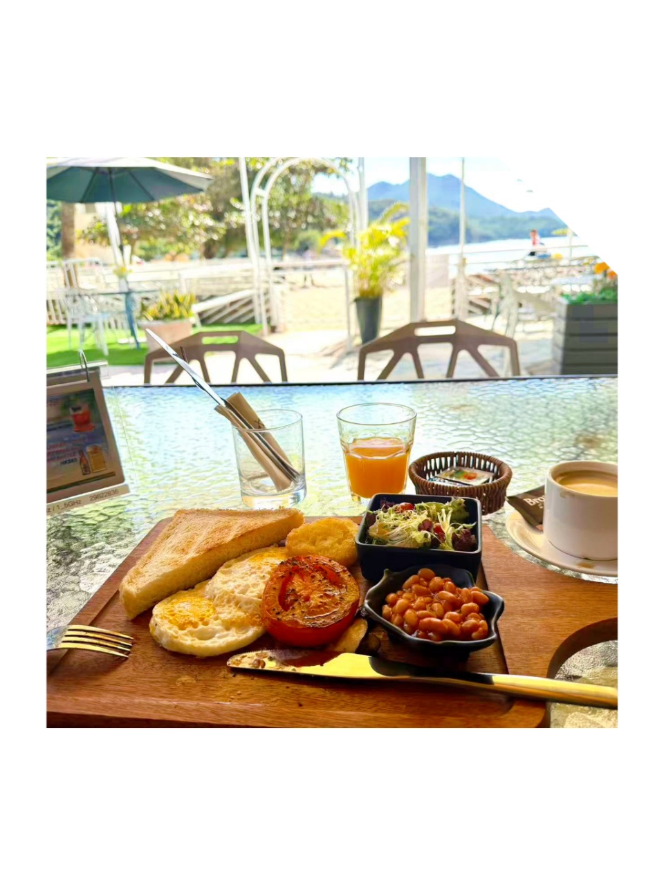 最值的就是這個住客專享福利!只需$80港幣,就能在180°海景前,享用一份完整的美式早餐Set,現榨果汁+自選茶或即磨咖啡,嫩滑煎蛋和香腸搭配烤吐司,望著天藍海闊慢慢吃,度假感瞬間滿格